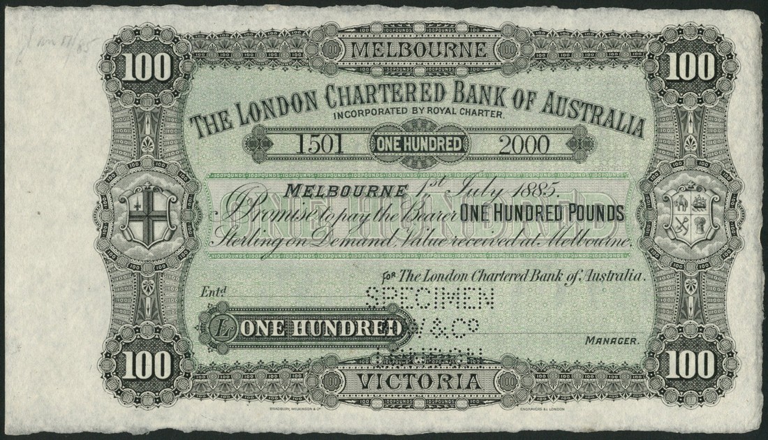 (†) The London Chartered Bank of Australia, printer's archival specimen, £100, Melbourne, 1 July 1885, serial run 1501 to 2000, black on bright green and grey-green underprint, value in all four corners, arms at left and right, reverse bright green and grey-green, value at centre, perforated SPECIMEN BW&Co LONDON
