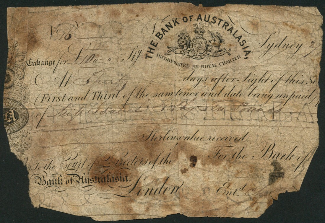 The Bank of Australasia, a sight bill for £10 payable '30 days after sight', Sydney, date excised, black and white, arms top centre,