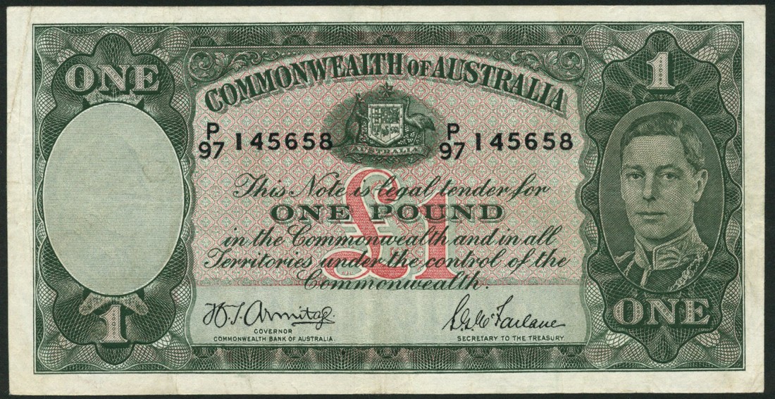 Commonwealth of Australia, 10 shllings, ND (1942), serial number F53 049540, £1, ND (1942), serial number P97 145658, 50 dollars, ND (1997-98), serial number IG 97690095, 100 dollars, ND (1996), serial numberGC 96847886, also Central Bank of Samoa 50 and 100 tala, ND (ca 1990)