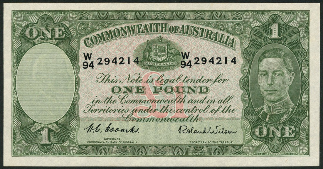 Commonwealth of Australia, £1 (2), ND (1942), serial number J/67 560179, W/94 294214, green on multicolour underprint, portrait King George VI at right, reverse, farmhands and sheep at centre, Armitage and Macfarlane