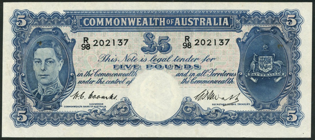 Commonwealth of Australia, £5, ND (1949), serial number R98 202137, deep blue on multicolour underprint, portrait King George VI at right, Coombs-Watt signatures, reverse workers with sacks, bales of hay and barrel at upper left