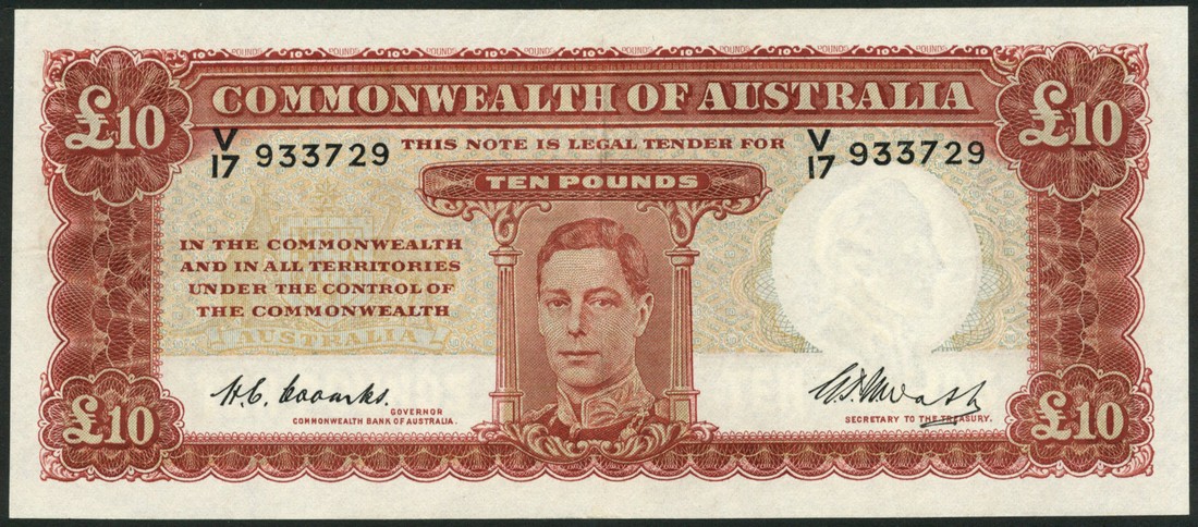 Commonwealth of Australia, £10, ND (1949), serial number V/19 933729, red and pale brown and green, George VI at centre, Coombs and Watt signatures, reverse red, frieze of allegorical agricultural figures at right