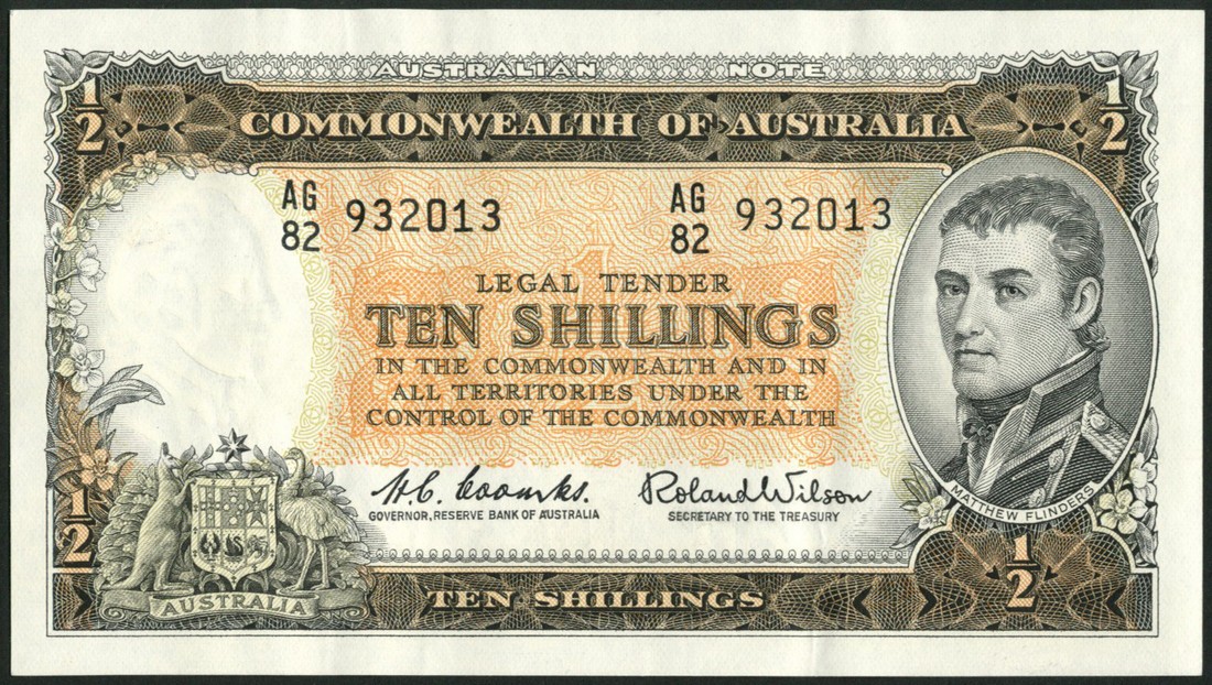 Commonwealth of Australia, 10 shillings (5), ND (1961-65), serial numbers AG/44 459270, AG/82 932013, AG/87 049732, AH/63 418715, AH/23 750000, dark brown on orange and green underprint, arms at lowe left, portrait Matthew Flinders at right, signature Coombs/Wilson, reverse Old Parliament House, Canberra