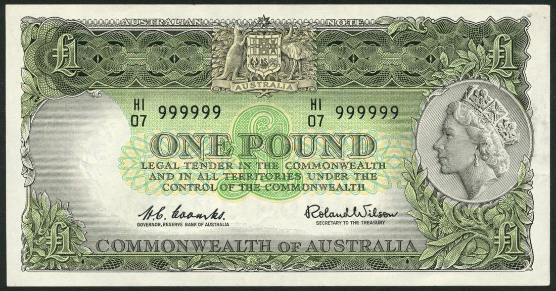 (x) A group of Australian interesting number notes, comprising 10/- and £1 (2), ND (1954-60), 10/- note numbered AF/89 1000000, the £1s numbered HI/07 999999 and HJ/04 400004, also a 'normal' 10/- note