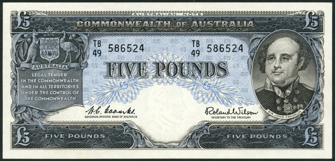 (x) Commonwealth of Australia, £5 (4), ND (1954), prefixes TB (2), TC (2), blue and multicoloured, Sir John Franklin at right, Coombs and Wilson signatures