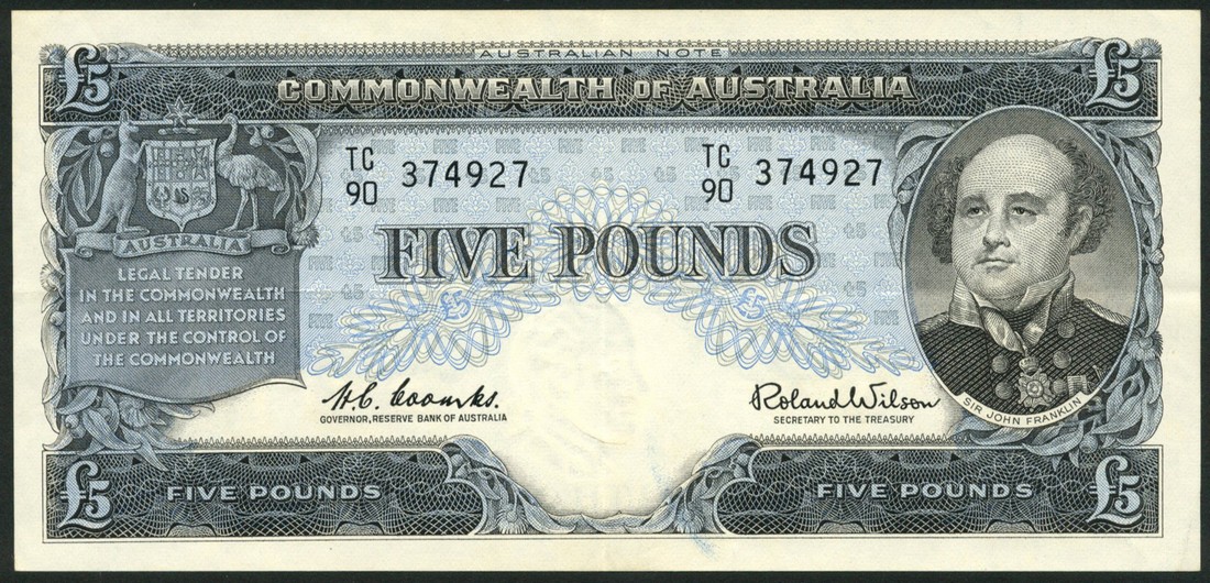 Commonwealth of Australia, £5, ND (1960-65), serial number TC/90 374927, black on pale blue underprint, portrait of Sir John Franklin at right, arms at left, reverse, blue, cattle, sheep and produce at left and right, shields and boomerang at cenre, a striking note