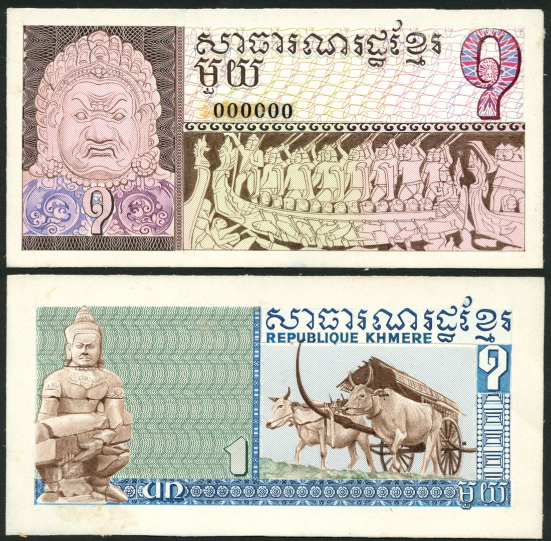 (†) Khmer Republic, obverse and reverse composite essay on card for a 1 Riel, ND (c1973), serial number 000000, brown, purple and pink on multicoloured underprint, stone carving from Banteay Srei Temple at left, stone frieze of galley and oarsmen at lower centre, value at upper right and lower left, reverse blue, green and brown, stone carving at left, water buffalo and cart at right, value in Khmer at upper right and French at lower left