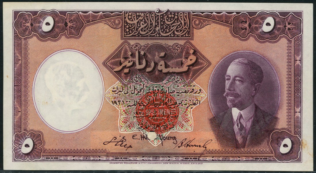 (x) Government of Iraq, specimen 5 dinars, law of 1 July 1931, no serial numbers, orange-brown and violet, King Faisal I at right, al Askari, Hilton Young and Hornsby signatures low right, reverse violet and white, value at left