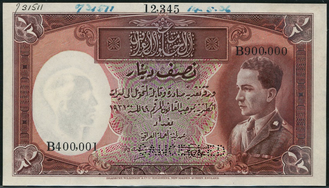 (x) Government of Iraq, specimen 1/2 dinar, 1 July 1931, serial number B 400001-B900000, brown and lilac and pink, King Ghazi at right, al Askari and Hornsby signatures, reverse brown and white, value at left