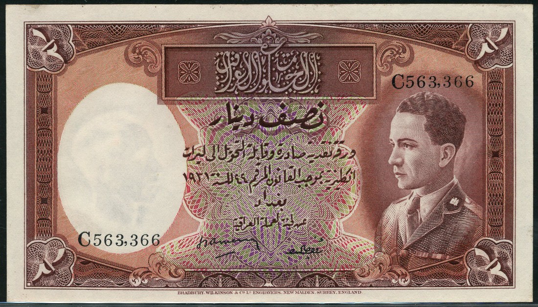 (x) Government of Iraq, 1/2 dinar, law of 1931 (1935), serial numbers C 563366, brown and multicoloured, King Ghazi at right, value at each corner, Amery and al Chadirchi signatures low centre, reverse brown and white, value in field