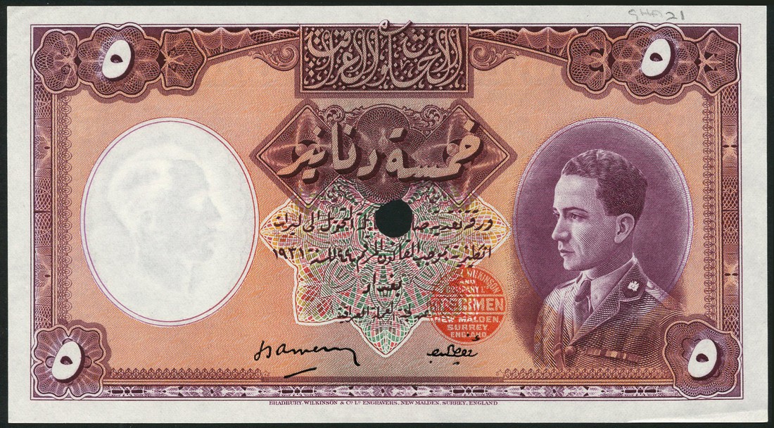 (†) Government of Iraq, colour trial 5 dinars, law of 1931 (1940), no serial numbers, purple and pale orange-brown, King Ghazi at right, value at each corner, signatures of Amery and Raouf al Chadirchi low centre, reverse purple and white, value at left
