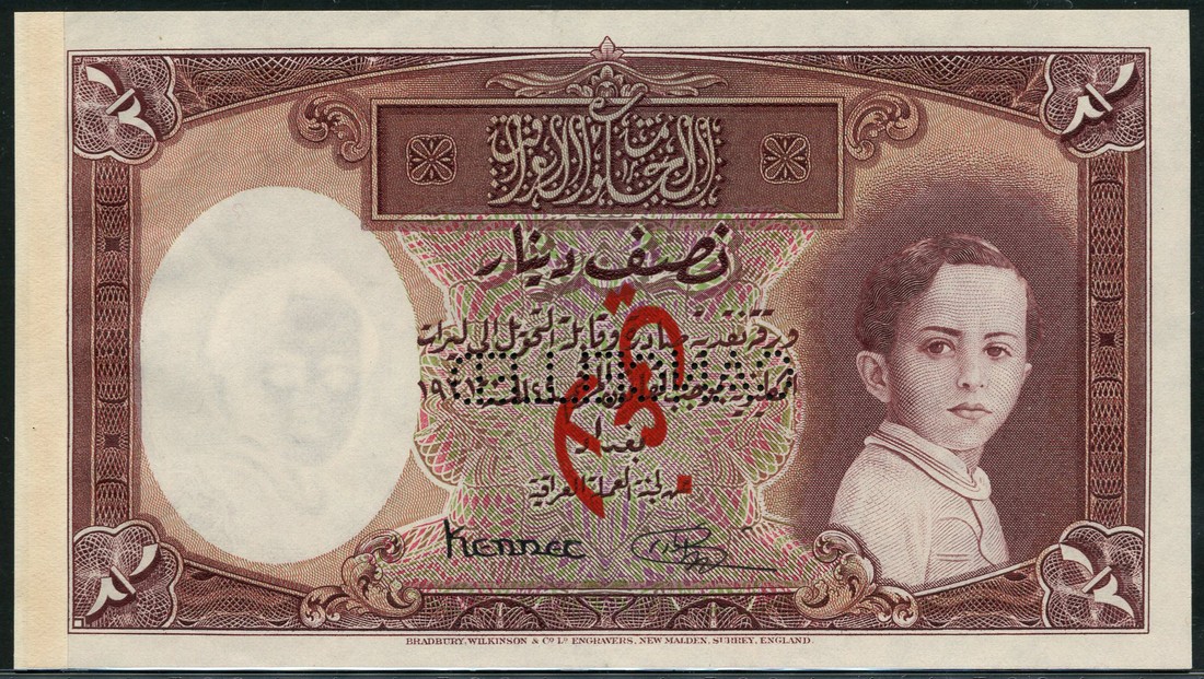 (x) Government of Iraq, specimen 1/2 dinar, law of 1931 (1935), no serial numbers, brown and multicoloured, King Faisal II as a child at right, value at each corner, Kennet and al Wadi signatures low centre, reverse brown and white, value in field