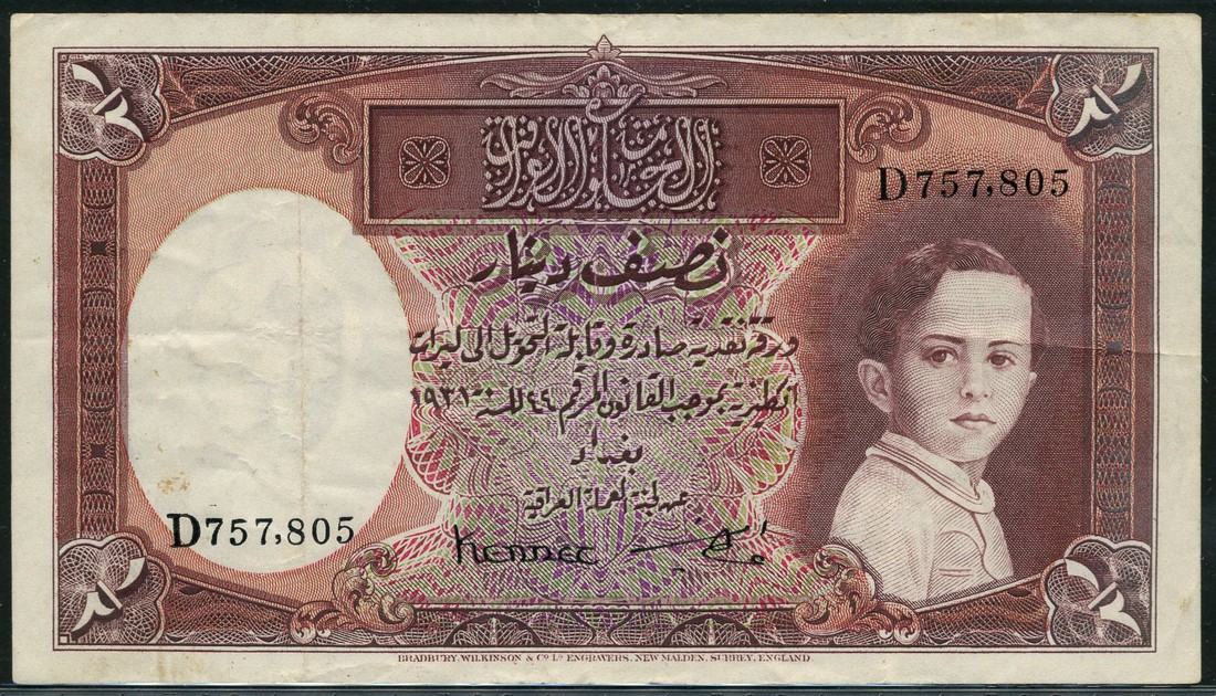 (x) Government of Iraq, 1/2 dinar, law of 1931 (1935), serial numbersD 757805, brown and multicoloured, King Faisal II as a child at right, value at each corner, Kennet and Ata Amin signatures low centre, reverse brown and white, value in field