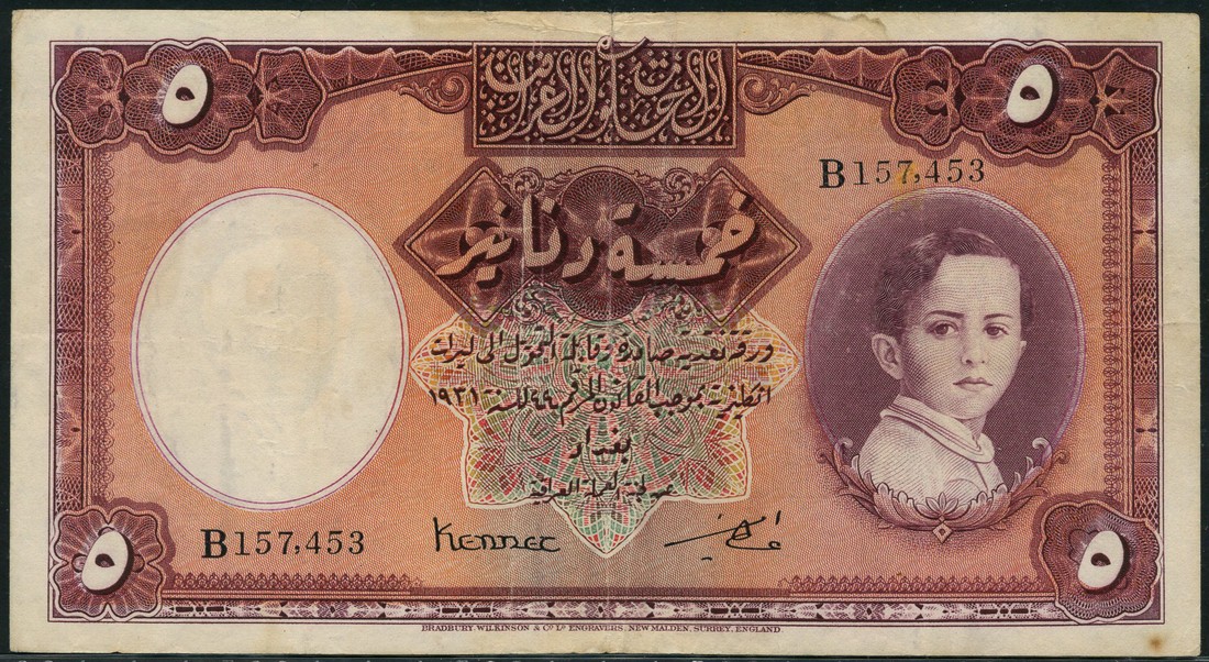 (x) Government of Iraq, 5 dinars, law of 1931 (1935), serial numbers B 157453, purple and pink and multicoloured, King Faisal II as a child at right, value at each corner, Kennet and Ata Amin signatures low centre, reverse purple and white, value in field