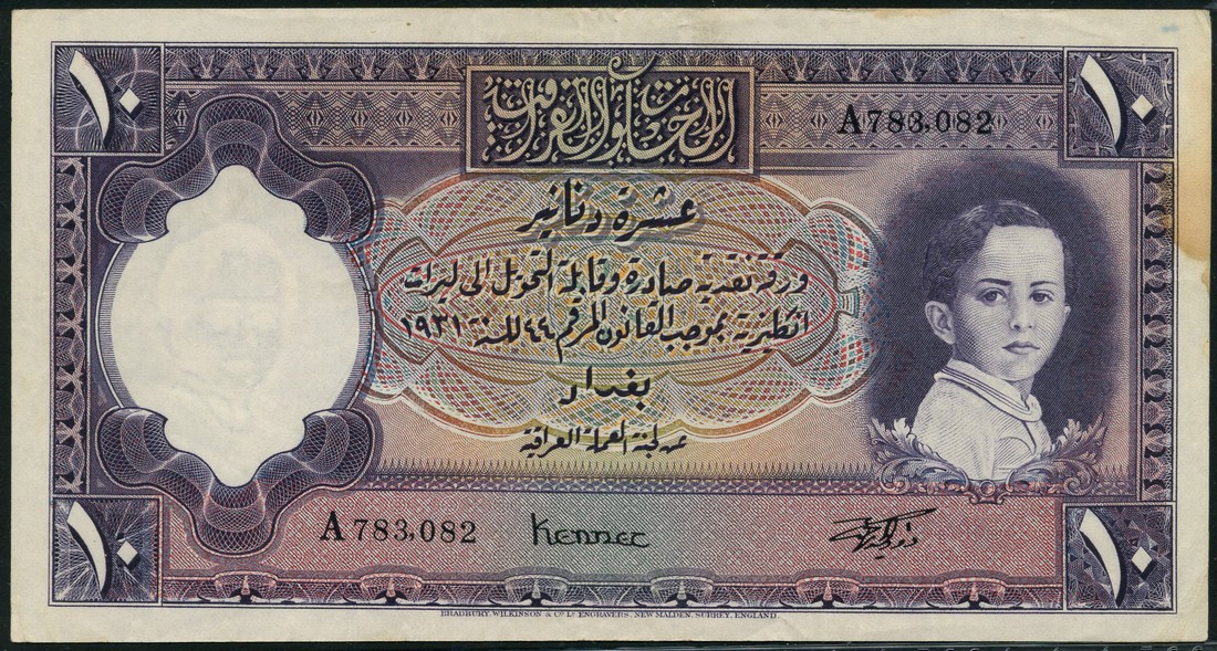 (x) Government of Iraq, 10 dinars, law of 1931 (1935), serial numbers A 783082, violet and multicoloured, King Faisal II as a child at right, value at each corner, Kennet and al Haidari signatures low centre, reverse violet and white, value in field