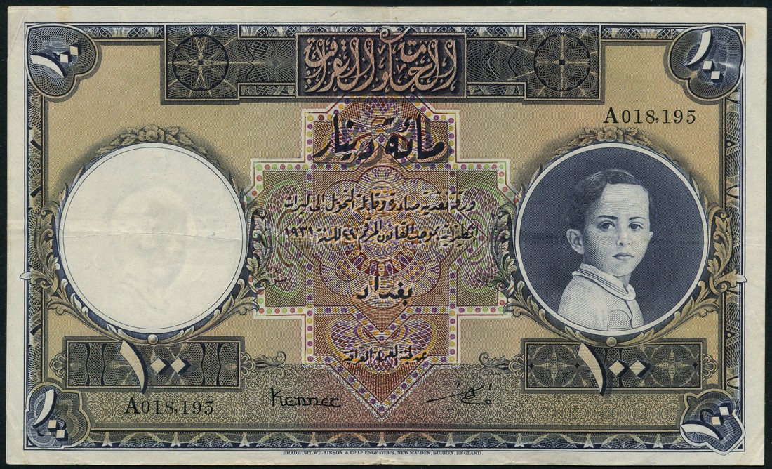 (x) Government of Iraq, 100 dinars, law of 1931 (1935), serial numbers A 018195, blue and multicoloured, King Faisal II as a child at right, value at each corner, Kennet and Ata Amin signatures low centre, reverse blue and white, value in field