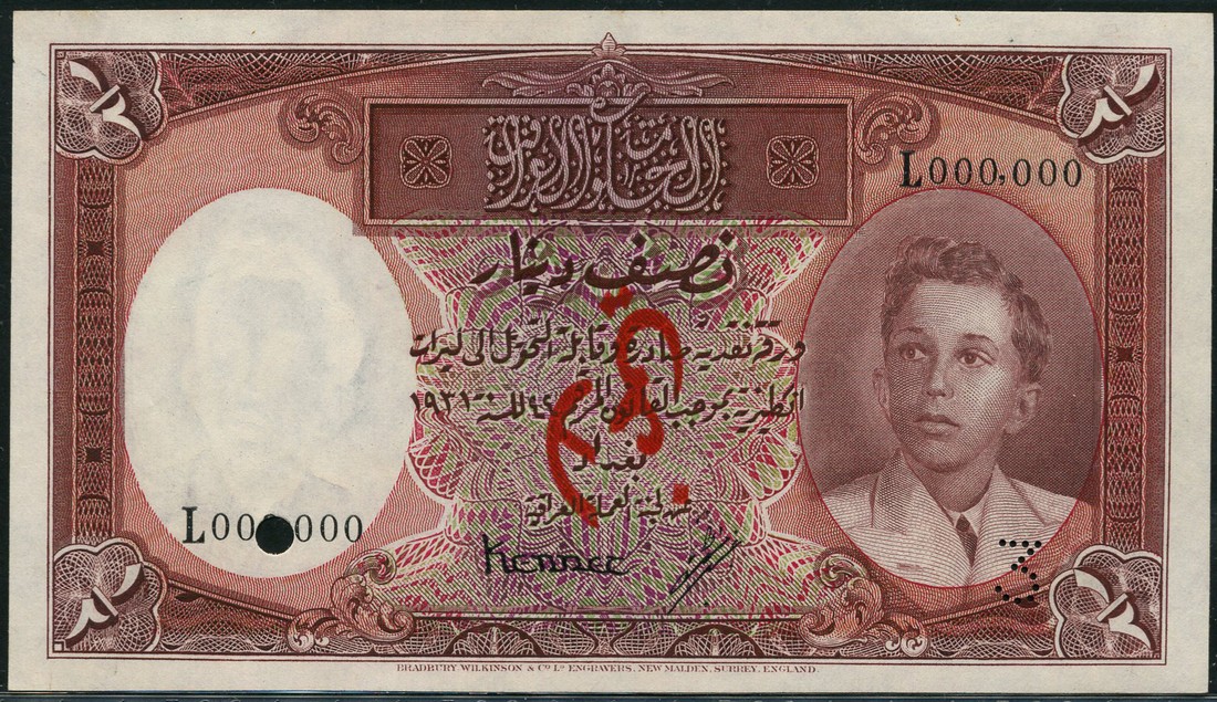 (x) Government of Iraq, specimen 1/2 dinar, law of 1931 (1945), serial number L 000000, red-brown and lilac, King Faisal II as a boy at right, Kennet and al Khudairi signatures, reverse red-brown, value in field