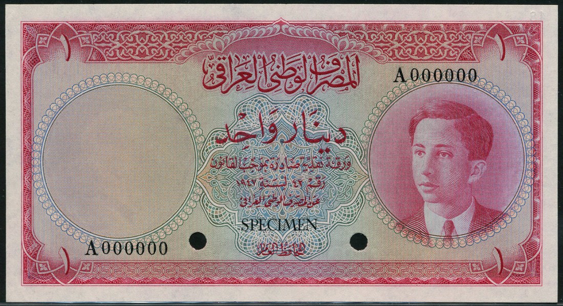(x) National Bank of Iraq, colour trial 1 dinar, law of 1947 (1950), serial number A 000000, red and pale blue and pink, King Faisal II as a young man at right, reverse red, an equestrian statue of King Faisal I at centre, value at left and top left and right