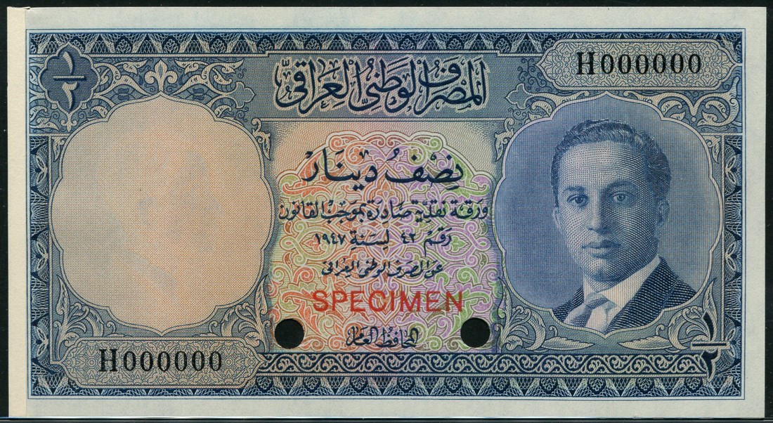 (x) National Bank of Iraq, colour trial 1/2 dinar, law of 1947 (1950), third issue, serial number A 000000, blue and pink and green, King Faisal II as an adolescent man at right, reverse blue, the spiral minaret at Samarra at centre, value at left and at each corner