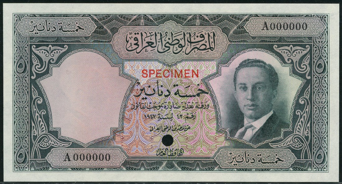 (x) National Bank of Iraq, colour trial 5 dinars, law of 1947 (1950), serial number A 000000, blue and pink, King Faisal II as a young man at right, reverse olive, Hammurabi receiving the scolls at centre, value at each corner