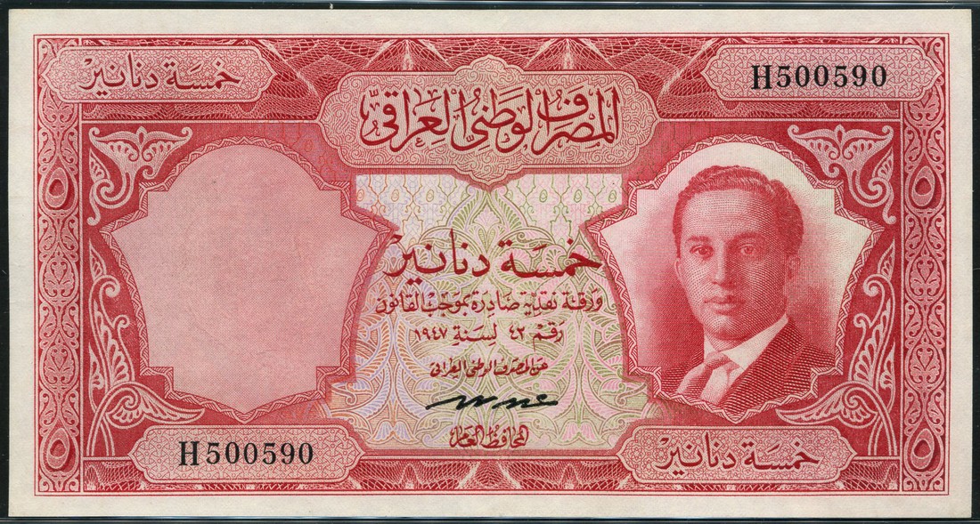 (x) National Bank of Iraq, 5 dinars, law of 1947 (1950), third issue, serial number H 500590, red and pale green and pink, King Faisal II as a young man at right, Abdul Hafudh signature low centre, reverse red, Hammurabi receiving the scrolls at centre, value at centre and at each corner