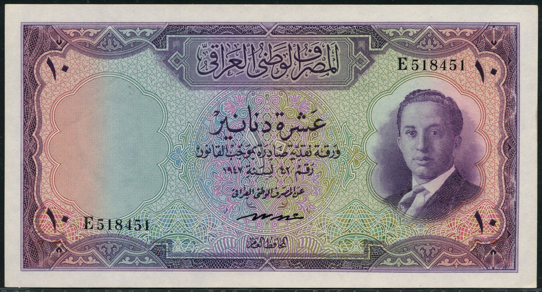 (x) National Bank of Iraq, 10 dinars, law of 1947 (1950), third issue, serial number E 518451, purple and multicoloured, King Faisal II as a young man at right, Abdul Hafudh signature low centre, reverse purple, Assyrian ox and priest at centre, value at left and at each corner