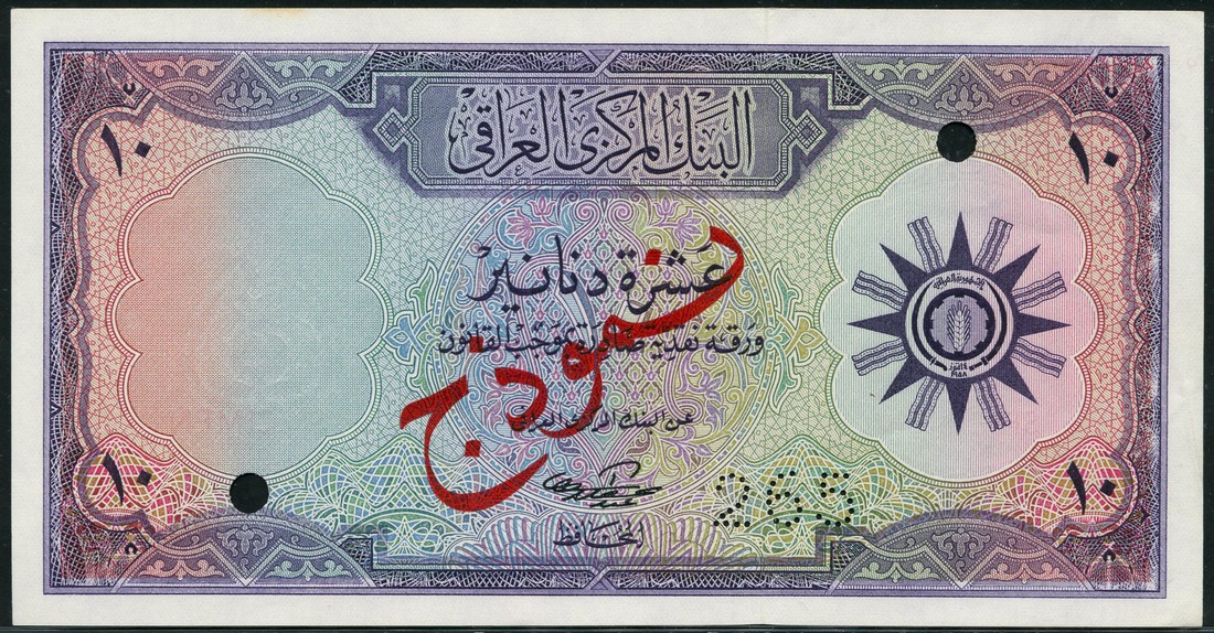 (x) Central Bank of Iraq, a specimen set of the ND (1959) issue comprising 1/4 dinar, green, 1/2 dinar, brown, 1 dinar, blue, 5 dinars, purple-red and 10 dinars, purple, all without serial numbers, all arms of the Republic at right and with security thread, all signature of Abdul Latif al-Shawaf