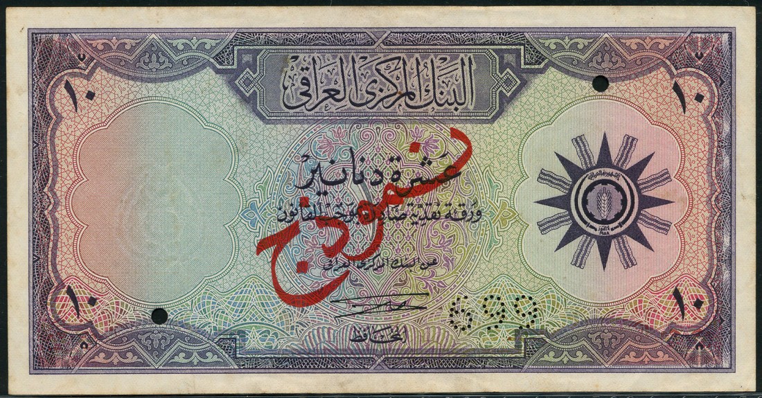 (x) Central Bank of Iraq, a specimen set of the ND (1959) issue comprising 1/4 dinar, green, 1/2 dinar, brown, 5 dinars, purple-red and 10 dinars, purple, all without serial numbers, all arms of the Republic at right and with security thread, all signature of Saleh Kubba