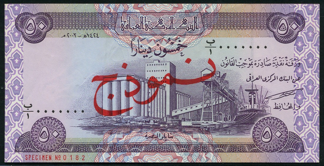 (x) Central Bank of Iraq, specimen 50 dinars, 2003, violet, also specimen 250 dinars, 2003, blue-grey, Salman signatures