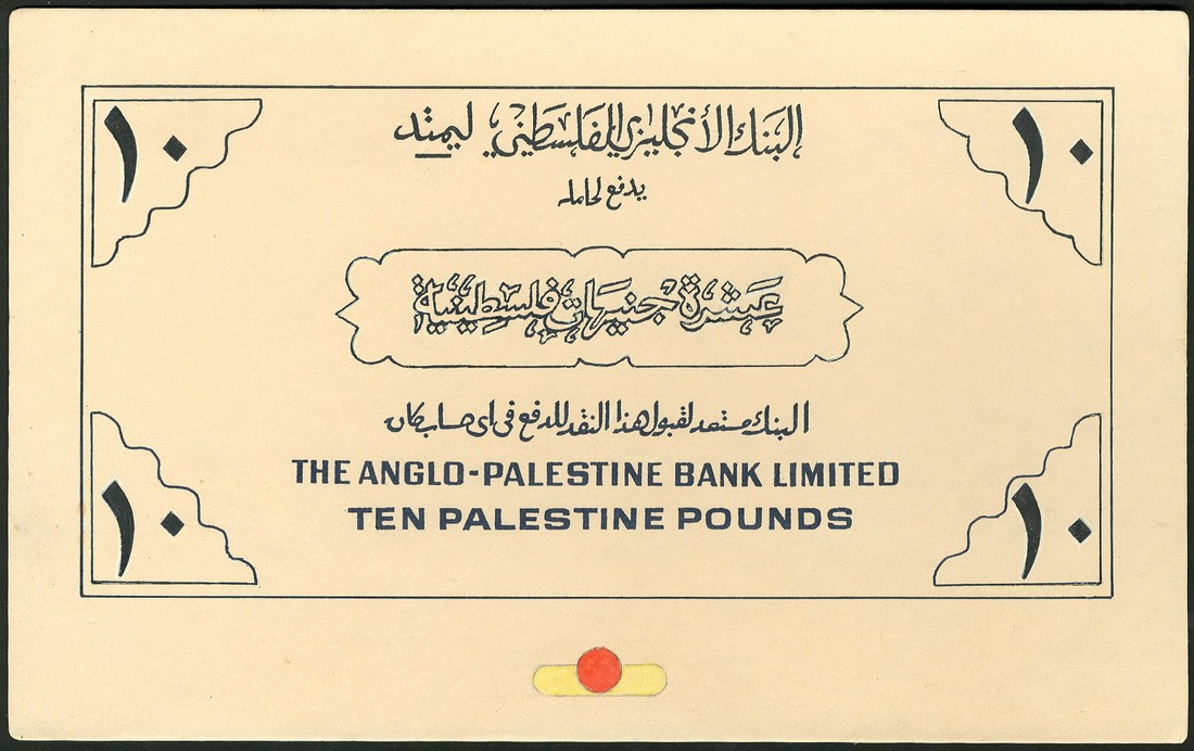 (x) Anglo-Palestine Bank Limited, a hand executed composite proof uniface essay for a Palestine ten pounds, ND (1948), black text on white with Arabic text added to design on large format board, value at centre and at each corner, a dark and light blue colour slug low centre