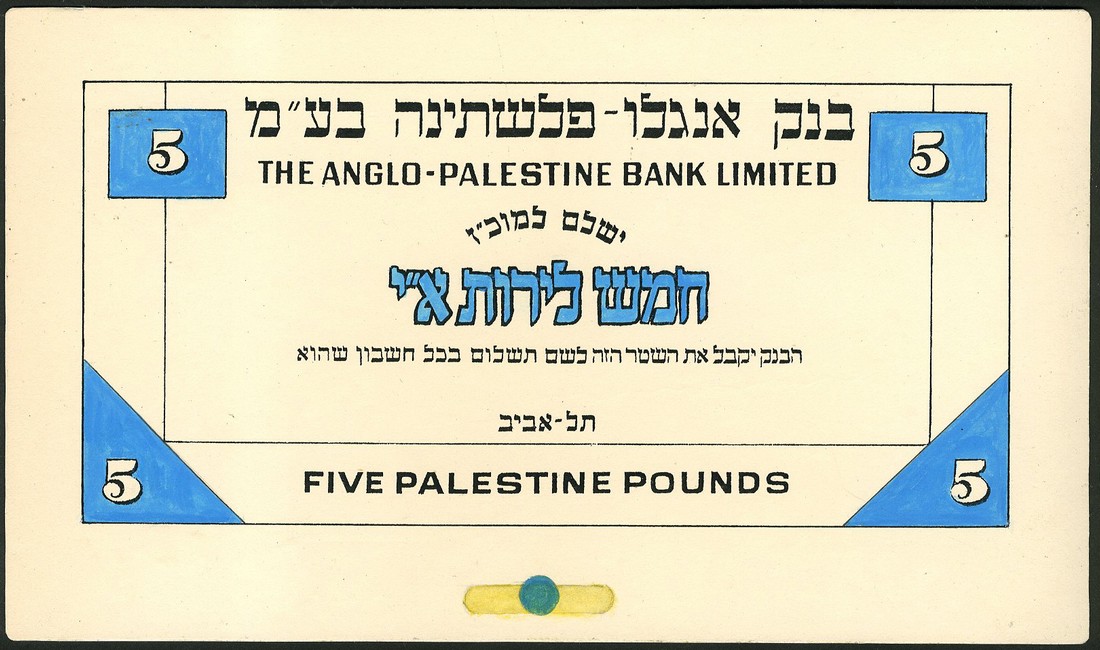 (x) Anglo-Palestine Bank Limited, a hand executed composite proof uniface 5 Palestine pounds, ND (1948), black text on white with value in blue on large format board, value at centre and at each corner, Tel Aviv in text low centre, a green and blue colour slug low centre