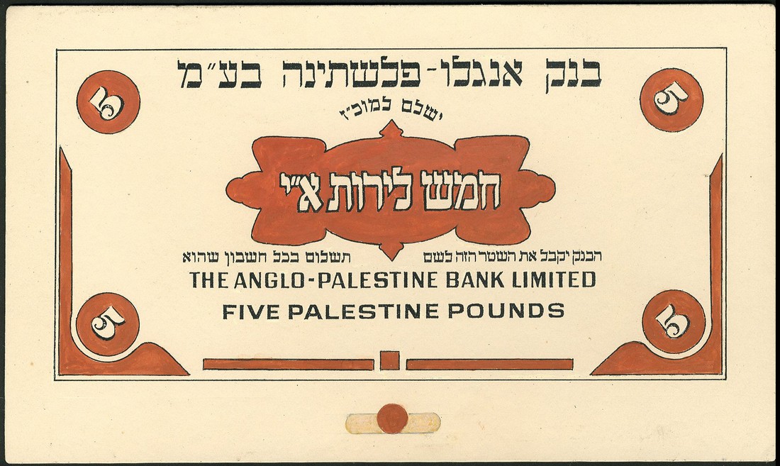 (x) Anglo-Palestine Bank Limited, a hand executed composite proof uniface 5 pounds, ND (1948), black text on white with value in brown on large format board, value at centre and at each corner, dark and pale light brown colour slug low centre