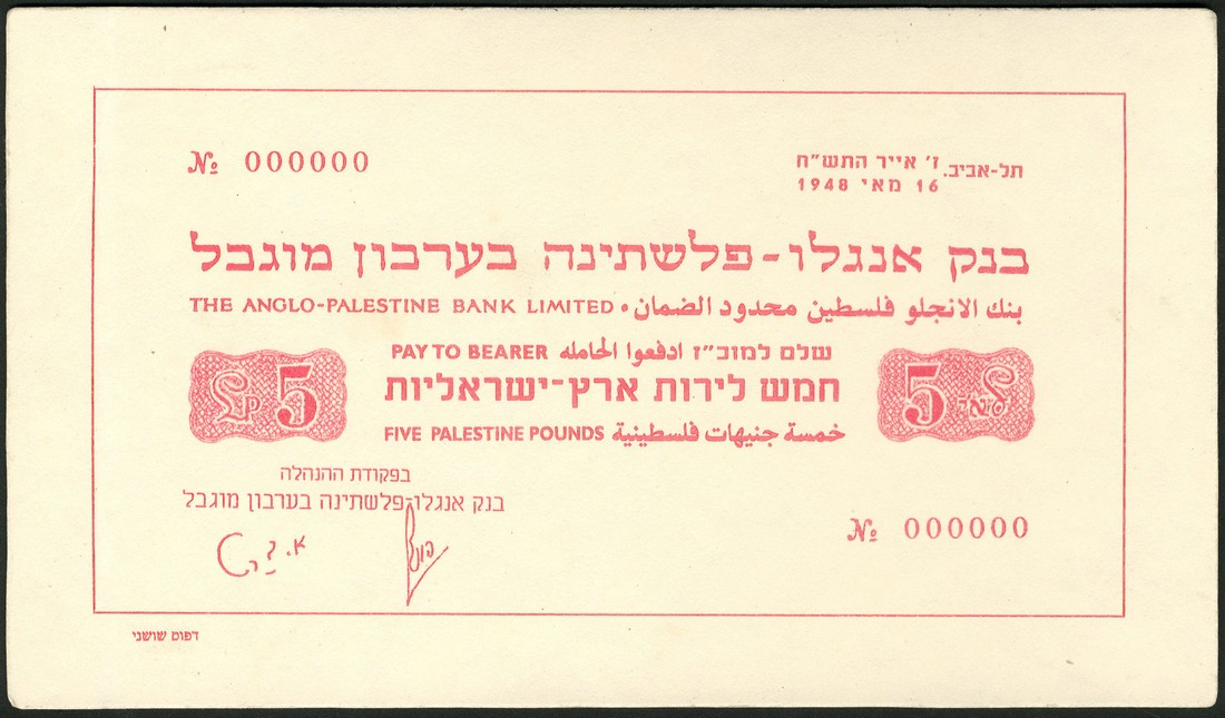 (x) Anglo-Palestine Bank Limited, a hand executed essay for a £5 on card, 16 May 1948, zero serial numbers, red text on white, value tablet at left and right, Hoofien and Barth signatures
