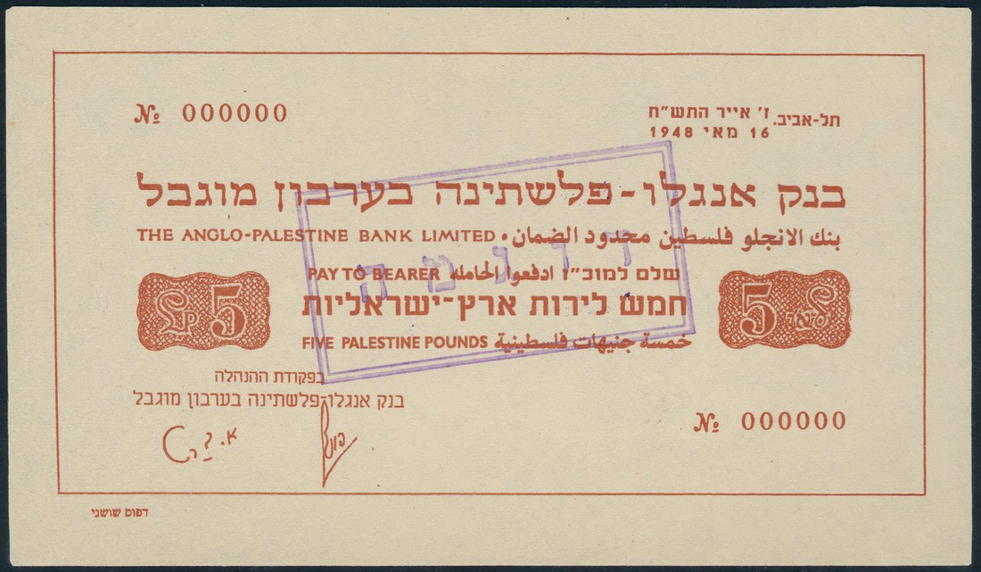 (x) Anglo-Palestine Bank Limited, Provisional issue, a proof 500 mils, 1 pound, 5 pounds and 10 pounds, 16 May 1948 (the State of Israel established 14 May 1948), all with red zero serial numbers, red text on cream cardlike paper, value in solid tablet at left and right, printed signatures in red of Hoofien and Barth