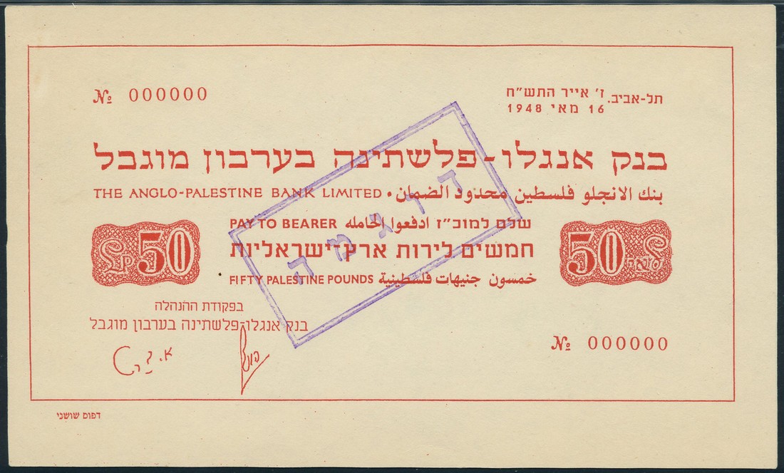 (x) Anglo-Palestine Bank Limited, Provisional issue, a proof 50 pounds, 16 May 1948, red zero serial numbers, red text on cream cardlike paper, value in solid tablet at left and right, printed signatures in red of Hoofien and Barth