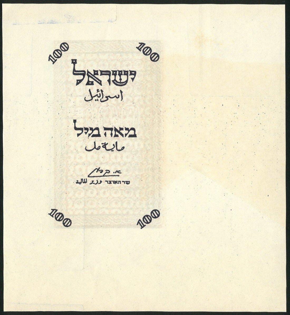(x) Anglo-Palestine Bank Limited, a proof uniface (colour trial) 100 mils on large format paper, 1948, black text on pale lilac and white, value at each corner, Kaplan signature