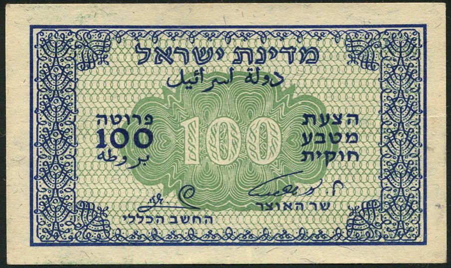 Israel Government, 50 and 100 pruta, ND (1952), red on orange underprint and blue on green underprint respectively