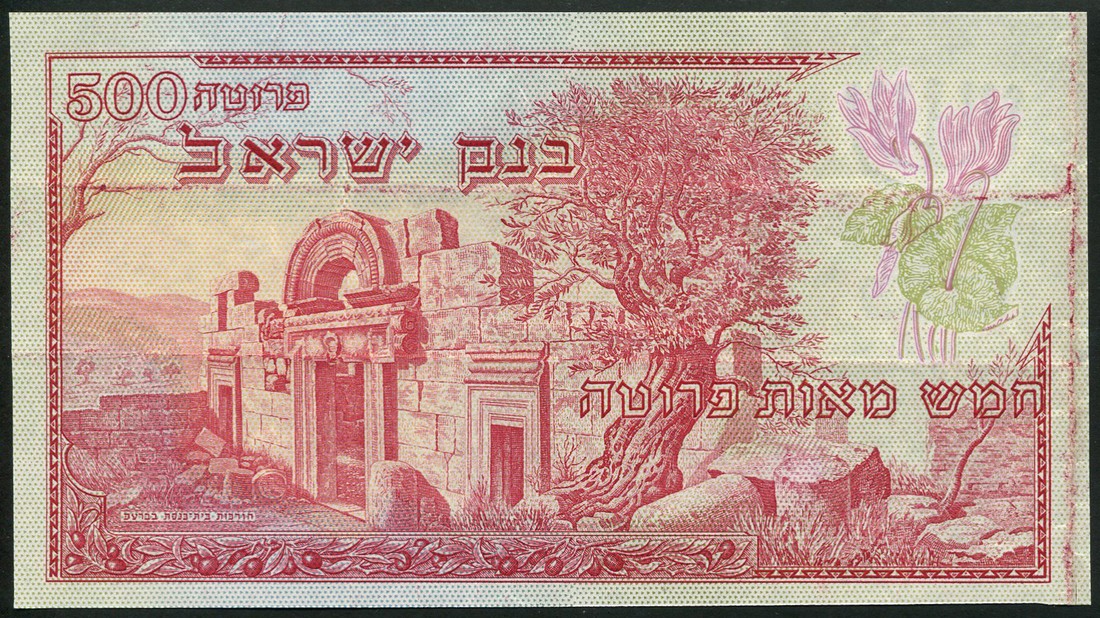 (x) Bank of Israel, a group of progressive proofs for the 500 prutah, ND (1954-1956), comprising one note with no numbers and signatures, onereverse proof and three partial backgrounds