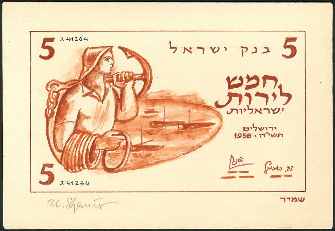 (x) Bank of Israel 'Ideal figures' series, a hand executed essay on board for a lira, 1958, serial number 41264, brown and white, sailor with anchor, boats in field at right, signature of Nebenzahl low right