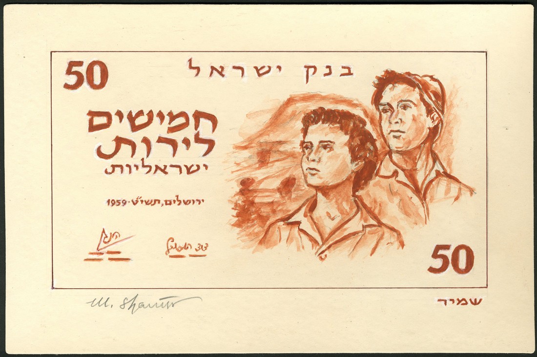 (x) Bank of Israel 'Ideal figures' series, a hand executed essay on board for a 50 lira, 1959, no serial numbers, red-brown and white, an allegorical couple representing 'the return of the exiles' at right, rural landscape in background, signature of Nebenzahl low right