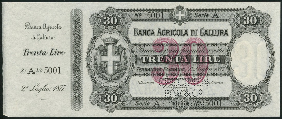 (†) Banco Agricola di Gallura, specimen 30 Lire, with counterfoil, 2 July 1877, serial number 5001, black and rose, arms at left, value in guilloches in each corner, reverse pale blue, value at left and at upper and lower centre, perforated SPECIMEN BW&CO. LONDON