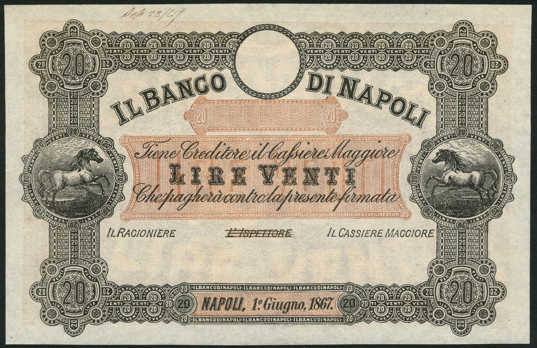 (†) Il Banco di Napoli, specimen 10 lire, black, white and green and specimen 20 lire, black, white and brown, both 1 June 1867, both horse at left and right