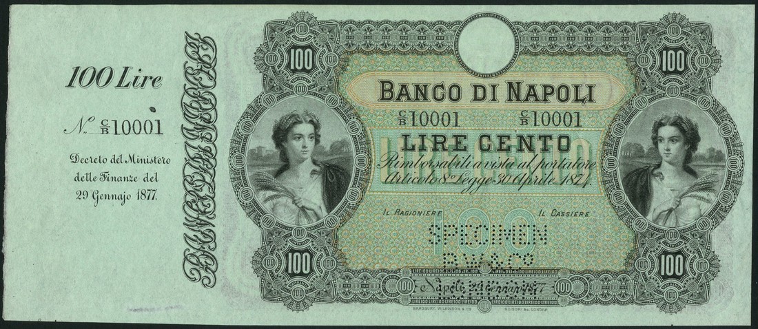 (†) Banco di Napoli, specimen 100 lire, 29 January 1877, serial number C/B 10001, black, green and multicoloured, Ceres at left and right, reverse red and green