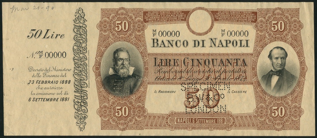 (†) Banco di Napoli, specimen 50 Lire, with counterfoil, 6 September 1881, serial number M/F 00000, brown and black, portrait of Galileo at left, Manna at right, value in guilloches in each corner, perforated SPECIMEN BW&CO. LONDON
