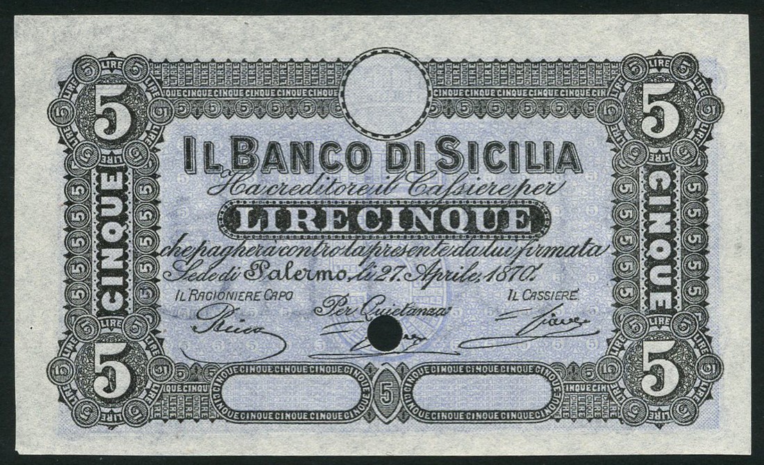 (†) Banco di Sicilia, specimen 5 Lire, Palermo, 27 April 1870, no serial numbers, black and pale blue, value in guilloches in each corner, reverse pale blue, value at centre and at left and right, one punch hole
