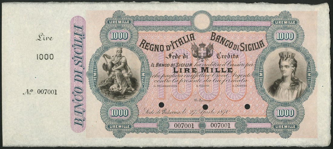 (†) Regno d'Italia, Banco di Sicilia, specimen 1000 lira, Palermo, 27 April 1870, serial nuber 007001, black, green, lilac and orange, turreted maiden at right, arms at top centre, King with eagle and cute puppy at left, reverse green and brown, triquetra (three legs) design at left and right, counterfoil at left, three cancellation holes