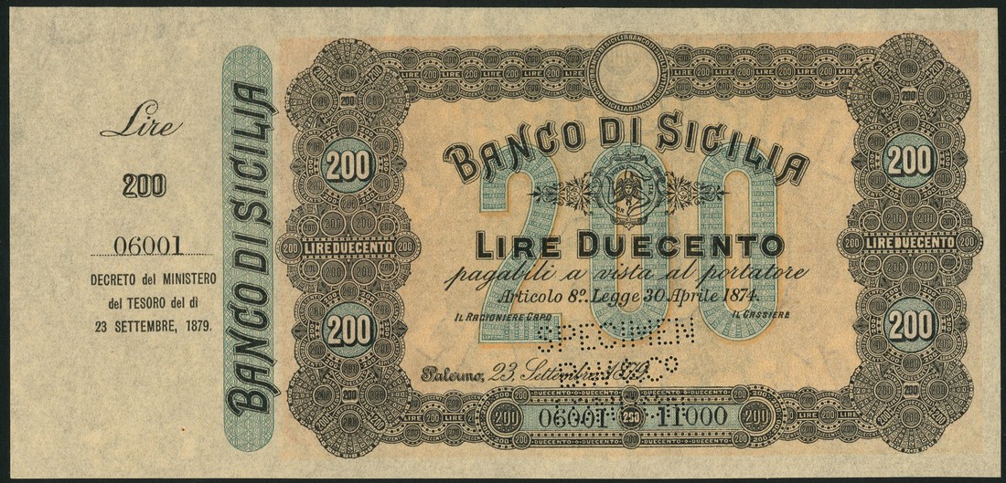 (†) Banco di Sicilia, specimen 200 lire, 23 September 1879, serial number 06001-11000, dark and light brown, triskeles top centre, value in green underprint at centre, orange and blue green, value
