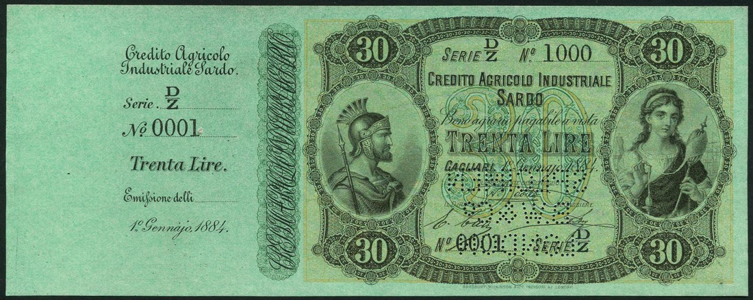 (†) Credito Agricolo Industriale Sardo, specimen 30 lire, Cagliari, 1 January 1884, serial number D/Z 0001-1000, green and pale orange, helmeted male head at left, maiden spinning at right, counterfoil at left, reverse green, head of Mercury at left and right