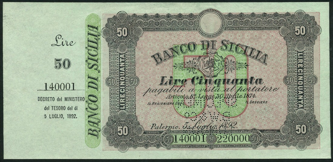 (†) Banco di Sicilia, printer's archival specimen 50 Lire, with counterfoil, 5 July 1892, serial number run 140001 to 220000, black and green on rose underprint, bank arms and value at centre and in each corner, reverse green and rose, value in guilloches, perforated SPECIMEN BW&CO. LONDON