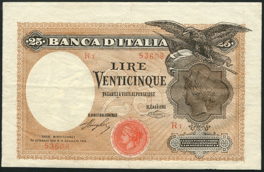 Banca d'Italia, 25 lire, 24 January 1918, red serial number R1-53608, dark and pale brown, Italia and eagle at right, Stringher and Sacchi signatures, reverse blue and white, head of Minerva at left, value at centre